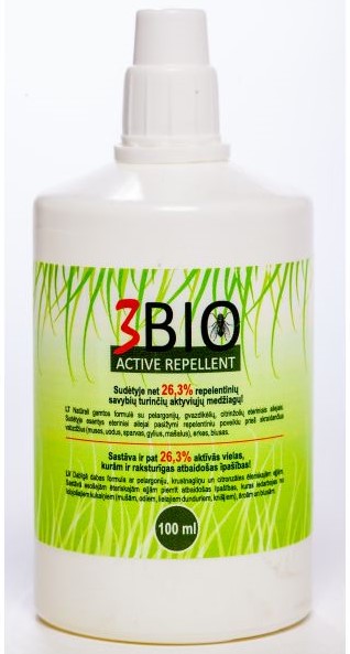 3BIO active repellent 100ml Lietošanai gatavs šķīdums. Dabīga formula ar pelargoniju, krustnagliņu un citronzāles ēteriskajām eļļām, kam piemīt atbaidošas īpašības uz lidojošiem kukaiņiem (mušām, odiem, lielajiem dunduriem, knišļiem), ērcēm un blusām.