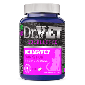 Dermatoloģiska papildbarība kaķiem, fretkām un trušiem. Satur nepieciešamās barības vielas ādas un kažoka veselībai, novērš matu izkrišanu un iekaisuma procesus ādā