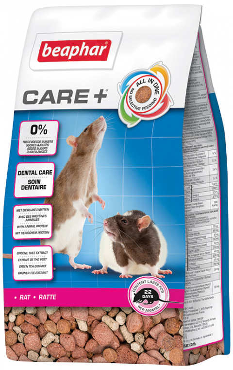 un kukaiņiem, un tāpēc Care+ barībā ir pievienotas dzīvnieku olbaltumvielas, lai nodrošinātu žurku dabiskas barības prasības. Satur visus žurkām nepieciešamas aminoskābes, vitamīnus un minerālvielas (ar speciālu formulu, labākai uzsūkšanai organismā), Omega 3 un Omega 6 pareizās attiecības veselīgai sirdij un pareizai asins cirkulācijai. Šī barībā ir pievienota Ehinacēja un Spirulina (lai stiprinātu dzīvnieka imūno sistēmu un paaugstinātu organisma pretošanas spējas slimībām), FOS un MOS (lai veidotu veselīgu zarnu mikrofloru), Yucca schidigera (lai mazinātu smaku no urīnas un ekskrementiem). Vitamīns E un Cell Protection System pasarga šūnas no bojājumiem. Speciālā barības granulu forma un cietība palīdz rūpēties par Jūsu dzīvnieka zobiem.