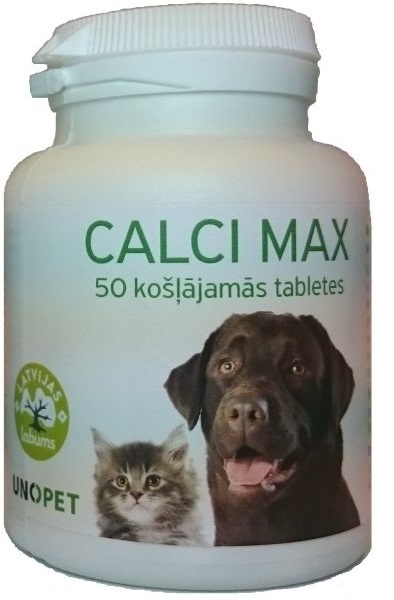 CALCI MAX 100 košļājamās tabletes. Papildbarība suņiem un kaķiem. Īpaši ieteicama augšanas periodā, kaulu lūzumu ārstēšanas laikā. Kā arī kucēm un kaķenēm grūsnības un laktācijas periodā. Satur kalcija un fosfora ieteicamo attiecību 2:1 un kaulu uzbūvei nepieciešamo kalcija citrātu, kura uzsūkšanos veicina fosfors, fluors un D3 vitamīns. Šo vielu trūkums var izraisīt kaulu trauslumu. Analītiskie komponenti: vistas organismā pārstrādāts kalcija karbonāts ar organiski saistītiem mikroelementiem un D3 vitamīnu. 100 g produkta satur: sausna 98,5%, eļļas un tauki 0,7%, koppelni 65,3%, kopproteīns 0,5%, kokšķiedra 0,1%, kalcijs 44,5%, foosfors 22,8%, fluors <0,12mg, D3 vitamīns 30uq. Sastāvs : dabīgs kalcija citrāts (pārstrādāts olu čaumalu pulveris), kukurūzas ciete, pretsalipes viela - magnija stearāts, aromātviela.