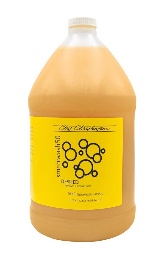 Chris Christensen SmartWash50 De-Shed Grooming Shampoo is a gentle, but highly concentrated formula that effectively removes loose coat. This 50:1 concentrated shampoo, enriched with moisturizers, helps to release shedding hair from the coat without irritating the skin, and may be used on extreme cases of heavily impacted matting. It leaves the coat looking fresh, healthy and shiny with a subtle banana coconut fragrance.