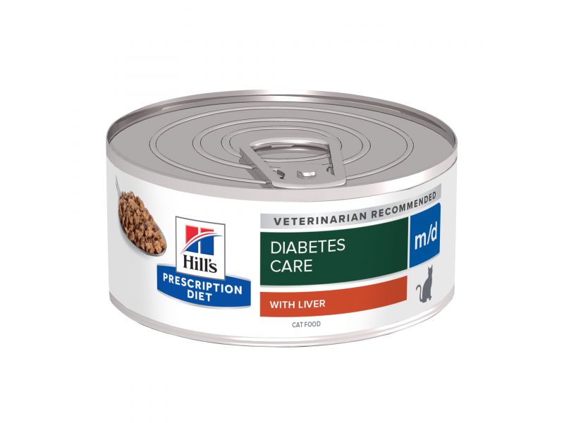 Hill's PRESCRIPTION DIET m/d kaķu barība ar aknām ir pilnvērtīga, diētiska lolojumdzīvnieku barība, kas ir paredzēta glikozes regulācijai (cukura diabēts) pieaugušiem kaķiem. Šai barībai ir mono- un disaharīdu zems līmenis. SASTĀVS: gaļa un dzīvnieku izcelsmes blakusprodukti (cūku aknas 44%), eļļas un tauki, augu izcelsmes blakusprodukti, augu olbaltumvielu ekstrakti, minerālvielas, dažādi cukuri, olas un olu blakusprodukti. Ogļhidrātu avots: kukurūzas ciete. ANALĪTISKIE KOMPONENTI: kopproteīns 13,1%, koptauki 6,3%, ciete 0,4%, cukuri kopā 1,1%, kokšķiedra 0,67%, koppelni 1,8%, mitrums 74,8%, kalcijs 0,22%, fosfors 0,17%, nātrijs 0,13%, kālijs 0,23%, magnijs 0,01%. Uzturfizioloģiskās piedevas uz 1 kg: A vit. 58299 SV, D3 vit. 260SV, 3b103 (dzelzs) 6,8mg, 3b202 (jods) 0,2mg, 3b405 (varš) 0,6mg, 3b503 (mangāns) 1,5mg, 3b603 (cinks) 21,6mg. Metabolizējamā enerģija (aprēķinātā): 4,6MJ/kg. DEVAS: Barot tikai ar šo barību. Pirms lietošanas vai lietošanas ilguma pagarināšanas ieteicams konsultēties ar veterinārārstu. Ieteicamais lietošanas ilgums: glikozes līmeņa regulēšanai: līdz 6 mēnešiem. Vienmēr jābūt pieejamam svaigam dzeramajam ūdenim. Neatvērtus konservus nedrīkst uzglabāt zem 10 ⁰C. Pēc atvēršanas uzglabāt ledusskapī. Sēriju un derīgs līdz: skatīt uz iepakojuma. Iepakojums: 156g.