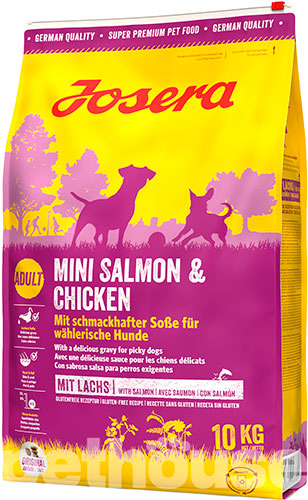 Pilnvērtīga barība (kroketēs) ar lasi un vistas gaļu, īpaši paredzēta mazo šķirņu pieaugušiem suņiem. Samazināts krokešu izmērs. Barība nesatur mākslīgās krāsvielas, glutēnu, konservantus un soju.