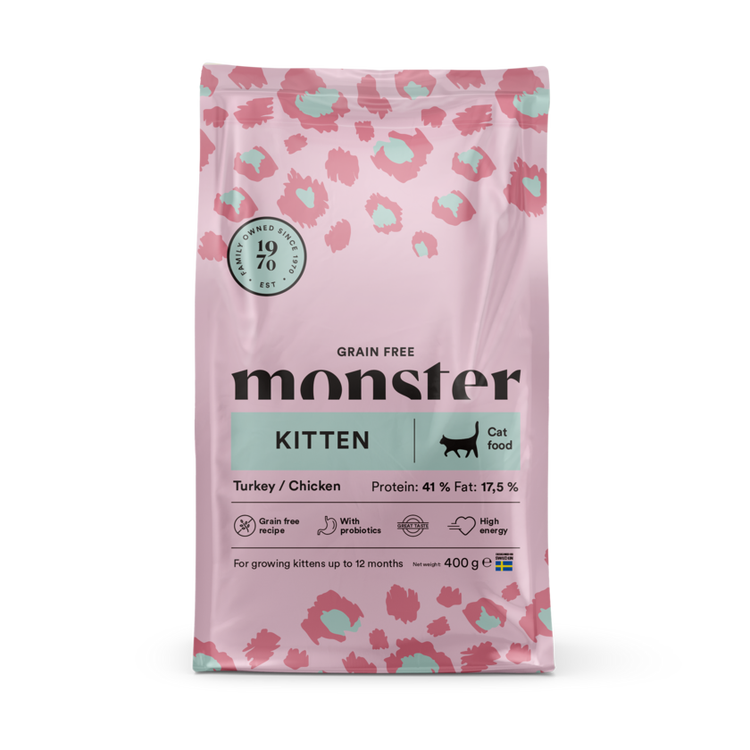 Sausā barība Monster Cat Grain Free Kitten Turkey & Chicken ir īpaši izstrādāta kaķēnu augšanas vajadzībām. Kaķēnam ir nepieciešamas lielākas enerģijas vajadzības nekā pieaugušam kaķim, un tam bieži vien ir jutīgāks kuņģis. Monster Cat Grain Free Kitten Turkey & Chicken satur visu nepieciešamo kaķēnam, vienlaikus esot saudzīgai pret kuņģi.