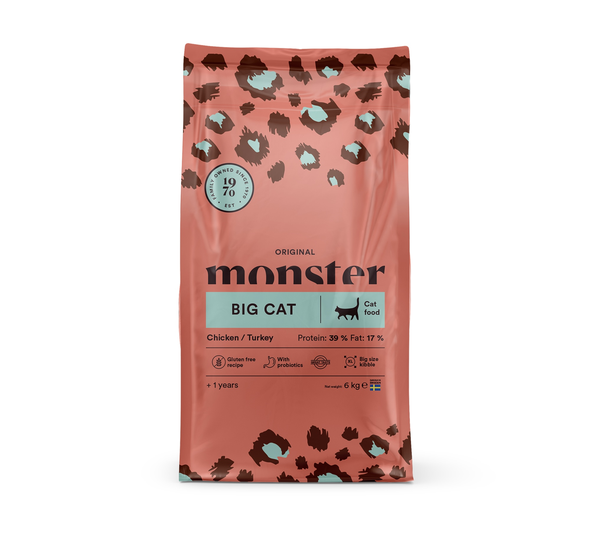Sausā barība Monster Cat Original Big Cat Chicken/Turkey. Ar pietiekami lielu barības granulu, lai to varētu sakošļāt un sajust labo garšu. Ar pievienotām labvēlīgajām zarnu baktērijām (Enterrococcus Faecium) un prebiotikām, kas baro labās baktērijas, lai tās varētu vairoties, viss labai zarnu veselībai. Ar glikozamīnu locītavu veselībai.