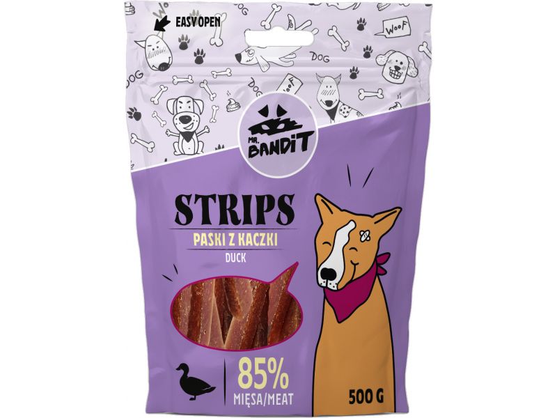 MR.BANDIT STRIPS DUCK / PĪLES STRĒMELES Papildbarība suņiem. Mr.Bandit ir gaļas našķis saldajam nemiera cēlājam! Bīstami garšīgs, nozags katra mīluļa sirdi! Super mīksta uzkoda suņu palaidņiem! Viegli sagremojama pīles fileja ir ideāls risinājums prasīgajiem palaidņiem. Garšīgs un maigs kārums, ko mīl visi suņi. Sastāvdaļas: Pīles krūtiņa 85,9%, glicerīns, zemesriekstu proteīns. Piedevas: konservanti. Analītiskie komponenti: Kopproteīns: 45%, koptauki: 1,5%, kopšķiedra: 0,2%, koppelni: 2%, mitrums: 21%. Lietošana: starp ēdienreizēm. Vienmēr jābūt pieejamam svaigam dzeramajam ūdenim. Kārumiem vajadzētu veidot ne vairāk kā 15% no jūsu suņa ikdienas uztura. Produkts neaizstāj ikdienas pilnvērtīgu barību. Produkts nav paredzēts lietošanai cilvēku pārtikā. Uzglabāt sausā, vēsā vietā. Iepakojums: 500g