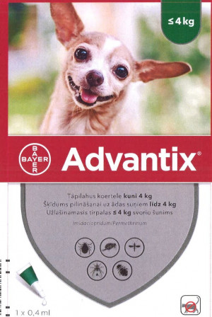 Advantix 200 mg/40 mg šķīdums (pipetes) pilināšanai uz ādas suņiem līdz 4 kg N4 Cena norādīta par 1gab.