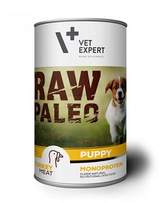 RAW PALEO PUPPY KUCĒNIEM ar tītara gaļu - pilnvērtīga un sabalansēta monoproteīna barība augošiem suņiem (konservi) no atšķiršanas līdz 1 gadu vecumam, ka arī grūsnām un laktējošām kucēm. Bez graudiem. Sastāvdaļas: tītara gaļa un tītara izcelsmes blakusprodukti 70%, buljons 28,7%, minerālvielas 1%, laša eļļa 0,2%, olu čaumalu pulveris 0,1%. Analītiskie komponenti: kopproteīns 10,3%, koptauki 5,3%, koppelni 2,5%, kokšķiedra 0,3%, mitrums 78%. Piedevas/kg: Uzturfizioloģiskās piedevas: vitamīni: D3 (E671) 200SV, E 90mg; mikroelementi: cinks (cinka helāts ar glicīna hidrātu, E6) 25mg, mangāns sulfāta (II) monohidrāts, E5) 1,4mg, jods (kalcija jodāts, bezūdens, E2) 0,75mg, selēns (nātrija selenīts, E8) 0,03mg. Lietošana: Ieteicamās dienas devas, kas norādītas tabulā uz iepakojuma, nodrošina suņa ikdienas uztura prasības. Vienmēr jābūt brīvi pieejamam svaigam dzeramajam ūdenim. Pēc atvēršanas uzglabāt ledusskapī un izēdināt 1 dienas laikā. Izēdināt istabas temperatūrā. Iepakojums: 400 g.