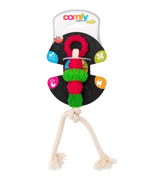 MINT DENTAL TOOTHER rotaļlieta, kas pieejama 3 variantos, ir izturīgas auklas un mājdzīvniekiem drošu plastmasas detaļu kombinācija. Tās atšķiras ar pērlīšu skaitu un kokvilnas aukliņas sasiešanas veidu. To dizains ļauj vienlaikus spēlēties un rūpēties par zobiem. Pateicoties izvirzījumiem un mezgliņiem, košļājot, no zobiem tiek noņemts aplikums un tiek masētas smaganas. Rotaļlietām raksturīgs piparmētru aromāts un pievilcīgas krāsas. Produkts satur mazas vai kustīgas detaļas, kas var būt bīstamas.