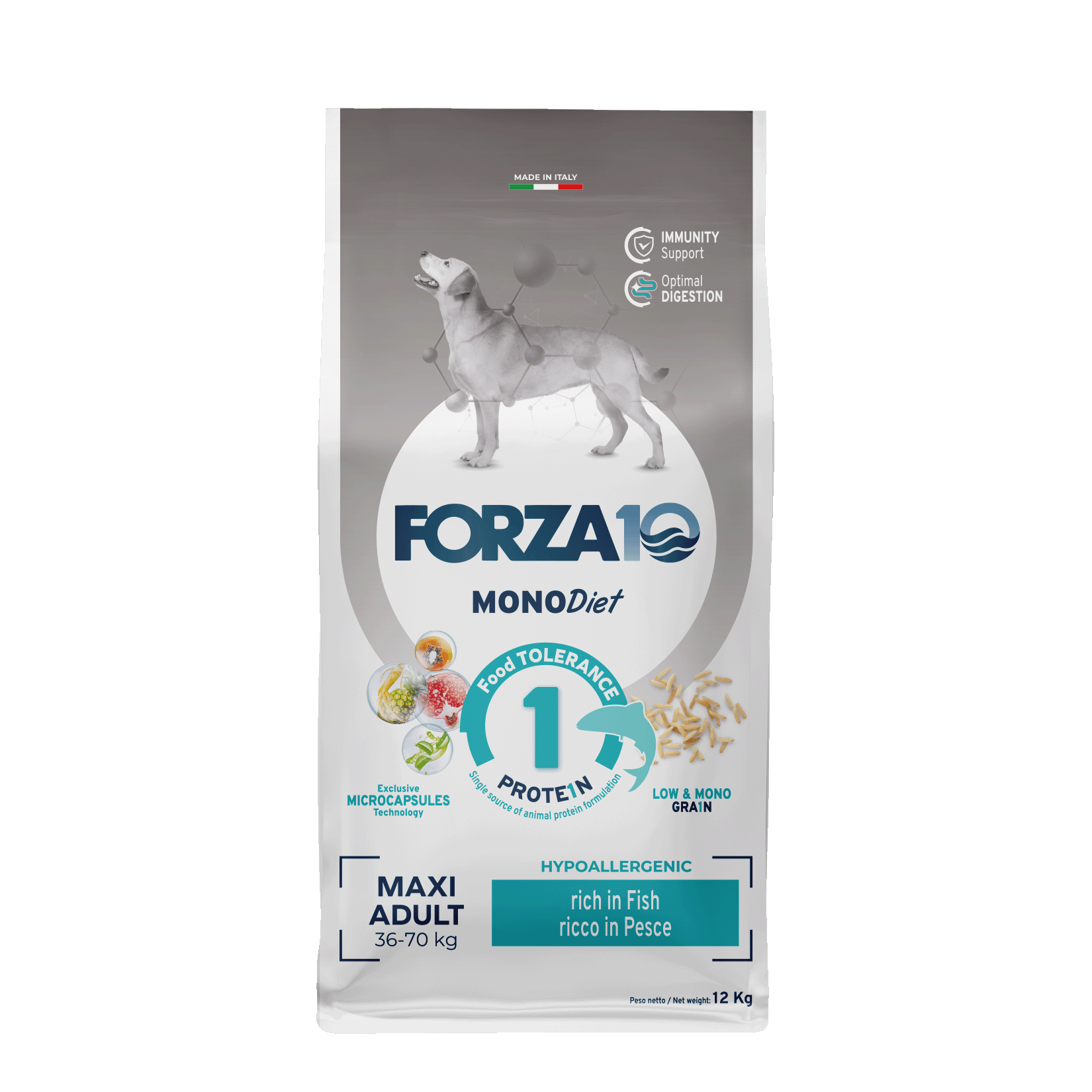 kukurūza, zivju milti (20%), kukurūzas eļļa, zivju eļļa, raugs, biešu mīkstums, minerālvielas, dehidrēts raugs (Bio MOS), FOS, augu eļļas un tauki (Elaeis guineensis), Yucca schidigera, ananāsa kāts (0,025%).