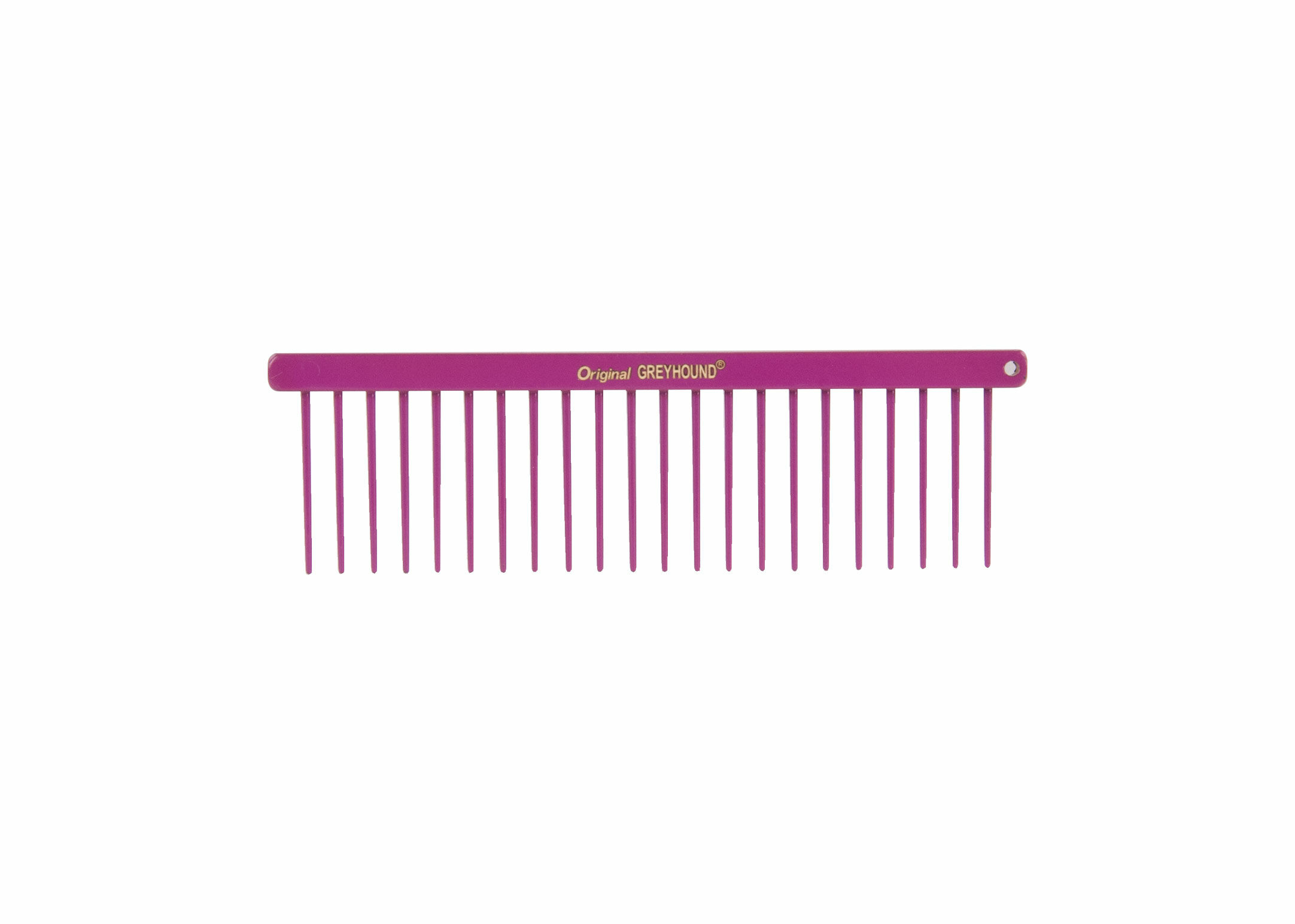 Greyhound rupjā ķemme, 11 cm, fuksijas krāsā ir kompakts kopšanas rīks, rūpīgi darināts ar rokām Anglijā, izmantojot augstas kvalitātes materiālus. Ķemme ar platiem, reti izvietotiem zobiem ir ideāli piemērota biezāku apmatojuma tipu pūkošanai un finiša veidošanai, kā arī vienmērīgai atšķetināšanai. Tās košais pulverkrāsas pārklājums nodrošina izturību un stilu. Lieliski piemērota ikdienas kopšanai vai detaļu apstrādei izstāžu sagatavošanas laikā.