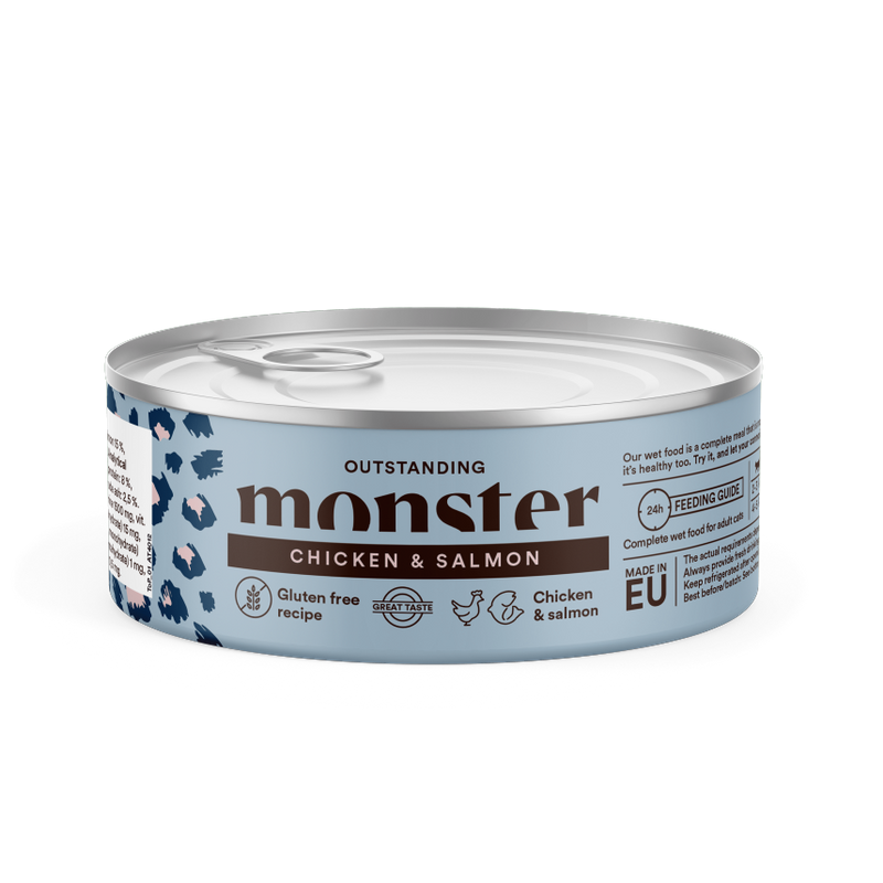 Konservi kaķiem Monster Cat Adult Multi Chicken&Salmon. Pagatavots bez kviešiem. Bezglutēna receptes, kas ir saudzīgas kuņģim, ādai un kažokam. Un kas samazina jutīguma un nepanesības attīstības risku. Vistas gaļa un lasis lieliskā kombinācijā, kas nodrošina neatvairāmu garšu. Vistas gaļa kā galvenā sastāvdaļa. Vistas gaļai ir gan augsta sagremojamība, gan augsta bioloģiskā vērtība. Tādējādi tā ir olbaltumvielu avots, ko organisms var absorbēt un izmantot ļoti augstā līmenī.