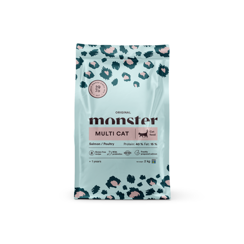 Sausā barība Monster Cat Original Multicat Salmon & Poultry ir īpaši pielāgota tiem, kam mājās ir vairāki dažādi kaķi. Šī kaķu barība ir izstrādāta, lai apmierinātu vairāku kaķu dažādās vajadzības. Gardā receptē, kas bagāta ar gardu, svaigi pagatavotu lasi, kā arī gardu vistu un tītaru. Izmēģiniet – un ļaujiet visiem jūsu kaķiem izlemt!