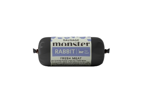 Konservi Monster Dog Sausage Rabbit ir pilnvērtīga barība bez graudiem, kas tikpat labi der kā atlīdzības našķis. Pateicoties viegli saliekamajai tekstūrai, to ir lieliski griezt kubiņos un turēt kabatā!