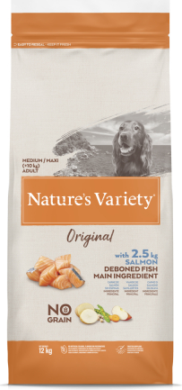 Nature's Variety Dog Original No Grain Medium Adult Salmon 12 Kg SAUSĀ BARĪBA VIDĒJIEM / LIELIEM (+10kg) PIEAUGUŠIEM SUŅIEM OPTIMĀLA FIZISKĀ FORMA Sabalansēts augstas kvalitātes olbaltumvielu un kaloriju daudzums, lai palīdzētu uzturēt muskuļu masu un aktivitātes līmeni. SPĪDĪGA SPALVA UN VESELĪGA ĀDA Omega-3, Omega-6 un cinks nodrošina spīdīgu spalvu un rūpes par ādu. VESELĪGA IMŪNSISTĒMA Augsts antioksidantu (E, C vitamīna, selēna) un olbaltumvielu saturs, lai stiprinātu imūnsistēmas darbību. SASTĀVS Atkaulots lasis* (21%), žāvēta tunča olbaltumvielas (20%), žāvēti zirņi* (12%), žāvēti kartupeļi* (9%), zirņu ciete*, mājputnu gaļas tauki* (7%), žāvēti turku zirņi* (5%), olbaltumvielu hidrolizāts (4%), zirņu šķiedrvielas*, žāvētas cigoriņu saknes*, kartupeļu olbaltumvielas, žāvēti burkāni* (0,5% līdzvērtīgi 4% svaigu burkānu), žāvēti āboli* (0,3% līdzvērtīgi 2% svaigu ābolu), minerālvielas. *Dabiskas sastāvdaļas. PIEDEVAS/kg. UZTURFIZIOLOĢISKĀS PIEDEVAS A vitamīns 27000 IU; D3vitamīns 1800 IU; E vitamīns 410 mg; C vitamīns 350 mg; dzelzs (II) sulfāta monohidrāts 260 mg (Fe: 86 mg); kālija jodīds 1,9 mg (I: 1,4 mg); vara (II) sulfāta pentahidrāts 33 mg (Cu: 8,8 mg); mangāna sulfāta monohidrāts 123 mg (Mn: 40 mg); cinka sulfāta monohidrāts 363 mg (Zn: 128 mg); nātrija selenīts 0,24 mg (Se: 0,11 mg). ANALĪTISKIE KOMPONENTI Mitrums 8,0 % Olbaltumvielas 28,0 % Tauki 17,0 % Šķiedrvielas 4,0 % Pelni 8,0 % Kalcijs* 1,8 % Fosfors* 1,0 % Omega-6* 2,8 % Omega-3* 1,00 % Taurīns** 1200 mg/kg Metabolizējamā enerģija* 3780 kcal/kg