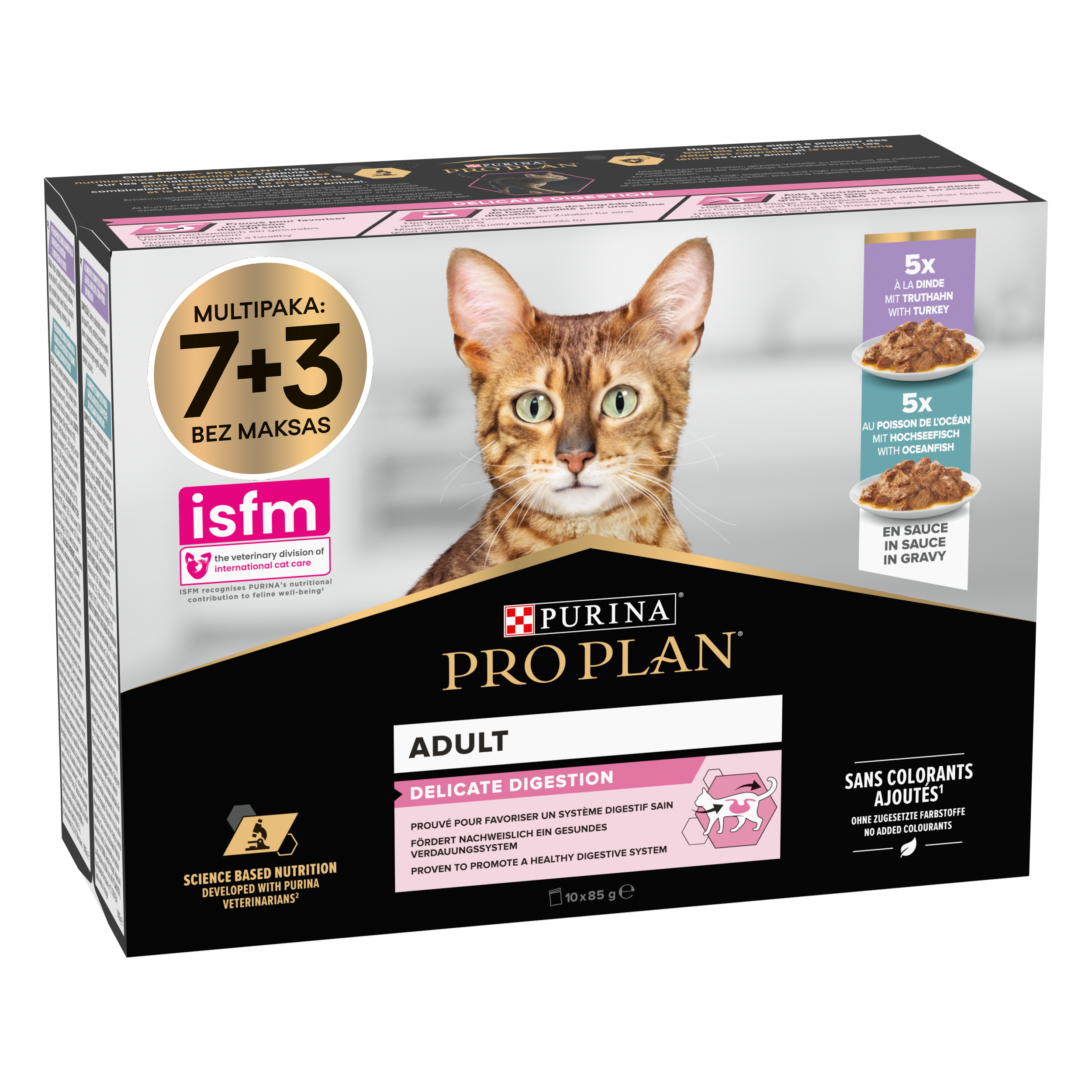 Rūpīgi izstrādāta recepte ar maigiem tītara gaļas vai okeāna zivju gabaliņiem gardā mērcē. Barība veicina veselīgu gremošanas sistēmas darbību un palīdz mazināt ar uzturu saistītas ādas reakcijas, nodrošinot kaķim komfortu un labsajūtu katru dienu.