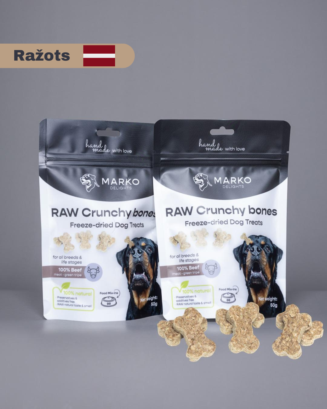 RAW Crunchy Bones ir augstas kvalitātes, liofilizēti suņu gardumi, kas gatavoti no 100% liellopa gaļas un zaļajām liellopa rētām (green tripe). Šie kraukšķīgie kaulu formas našķi ir dabīgi, barojoši un piemēroti visu šķirņu un vecumu suņiem.